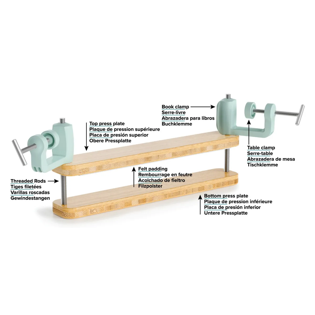 Du kannst sie flach auf deinem Tisch verwenden oder aufrecht klemmen, damit die Kanten sichtbar und tropffrei bleiben – perfekt zum Verkleben, Vergolden oder Stempeln von Buchkanten. Die filzgefütterte Platte schützt die Umschläge und sorgt für ein sauberes, gleichmäßiges Finish. Egal, ob du Journale gestaltest, Blumen pressst oder Bücher restaurierst – diese vielseitige Presse liefert Präzision und Langlebigkeit.