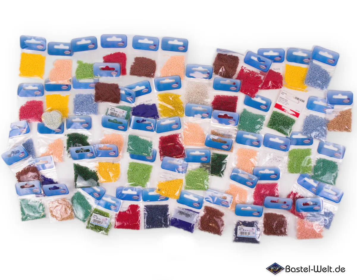 Insgesamt bekommst du 60 Tütchen Rocailles-Perlen mit einem Durchmesser von meist ca. 2,5 mm. Jedes Tütchen enthält etwa 10–16 g Perlen – perfekt portioniert für viele kleine und größere Projekte.