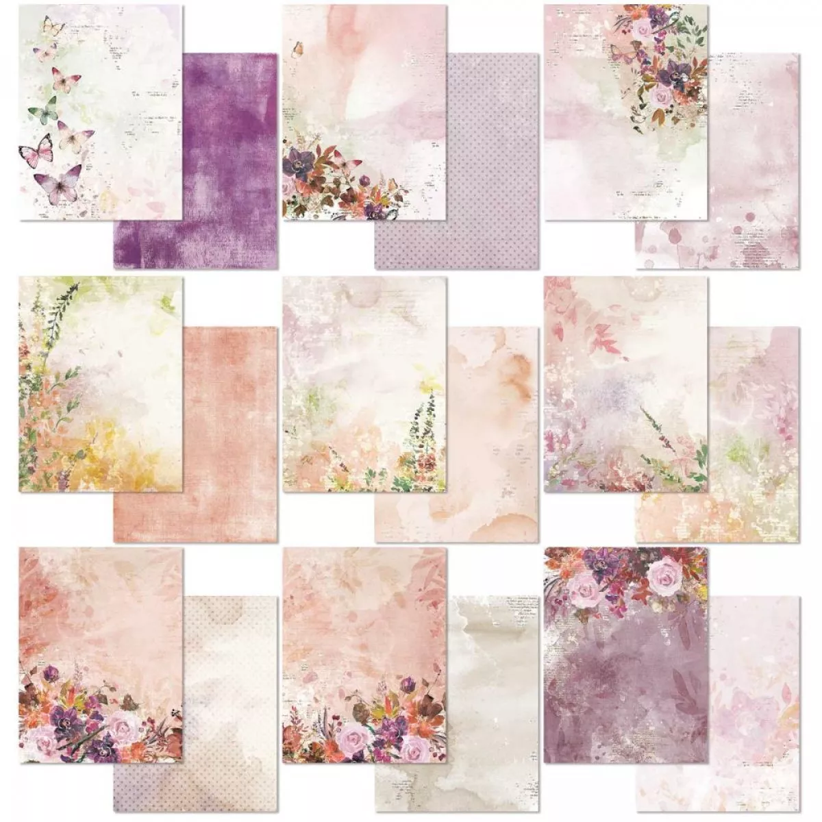 Das 15,2 x 20,3 cm große Kollektionspaket enthält insgesamt 28 doppelseitige Papiere (jeweils 3 in 9 doppelseitigen Designs) plus 1 Elementpapier mit raffiniertem Schnitt. Vorder- und Rückseite haben zusätzliche gemusterte Papiere auf der Rückseite.