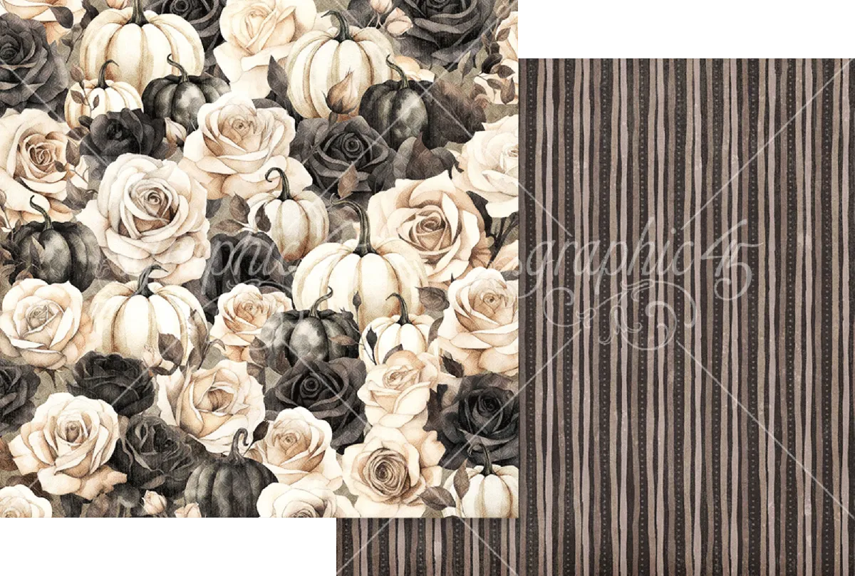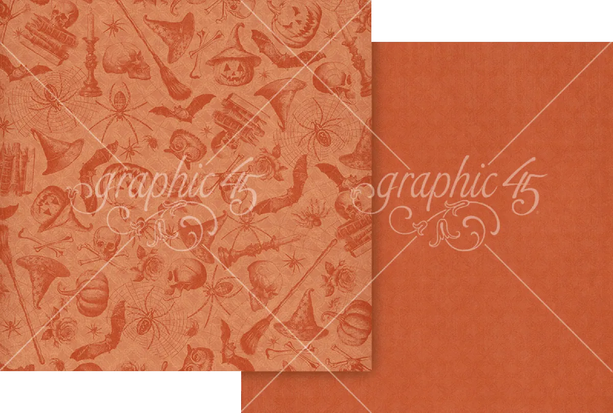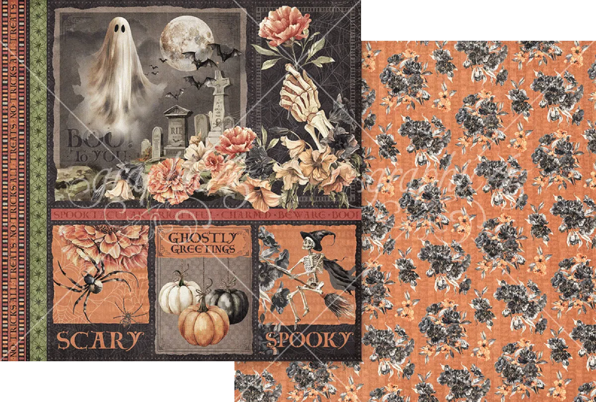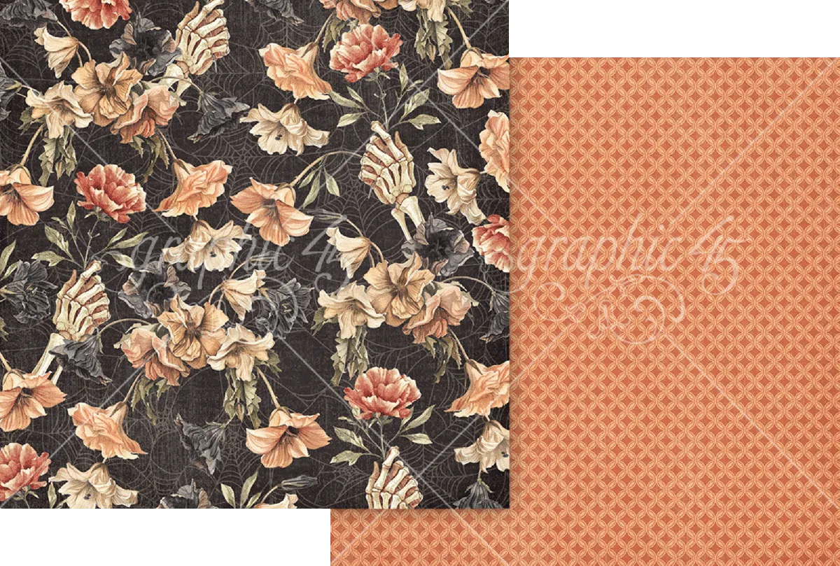 Tauche ein in eine Welt voller nostalgischem Halloween-Charme mit der Ghostly Greetings Papierkollektion von Graphic 45. Diese stimmungsvolle Kollektion zaubert einen traumhaften Halloween-Garten voller gespenstischer Geister, zarter Spinnweben, neugieriger schwarzer Fledermäuse und eleganter herbstlicher Blüten. Elfenbein- und Mitternachtkürbisse, verwitterte Grabsteine und skelettartige Details tanzen über eine Palette aus staubigem Orange, zartem Creme, tiefem Schwarz und antikem Rosé.