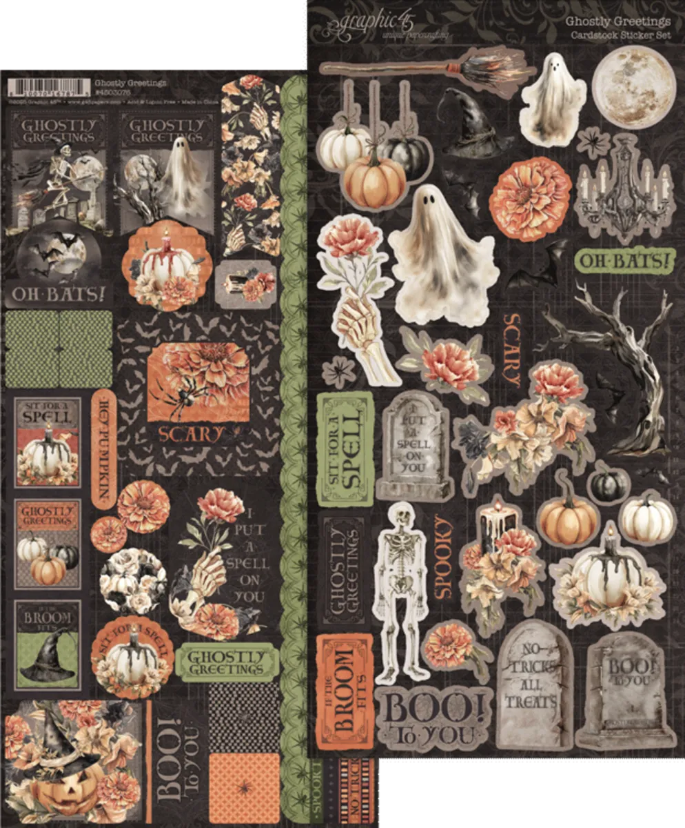 Tauche ein in eine Welt voller nostalgischem Halloween-Charme mit der Ghostly Greetings Papierkollektion von Graphic 45. Diese stimmungsvolle Kollektion zaubert einen traumhaften Halloween-Garten voller gespenstischer Geister, zarter Spinnweben, neugieriger schwarzer Fledermäuse und eleganter herbstlicher Blüten. Elfenbein- und Mitternachtkürbisse, verwitterte Grabsteine und skelettartige Details tanzen über eine Palette aus staubigem Orange, zartem Creme, tiefem Schwarz und antikem Rosé.
