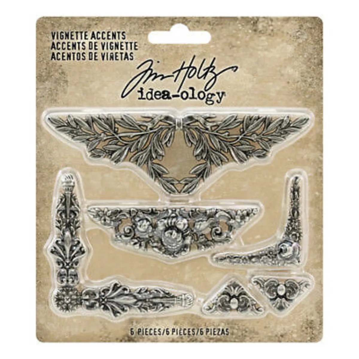 Vignettenverzierungen: Zierliche, filigrane Metallakzente zur Dekoration von Vignettenkästchen, Tabletts oder Paneelen. 6 Stück. Zur Orientierung: Die größte Vignettenverzierung ist etwa 10,6 cm breit.