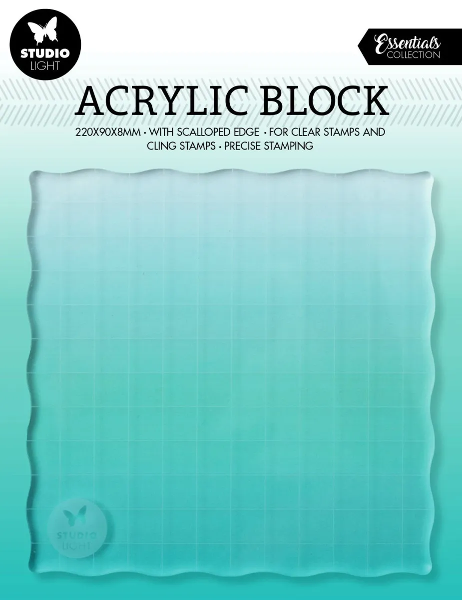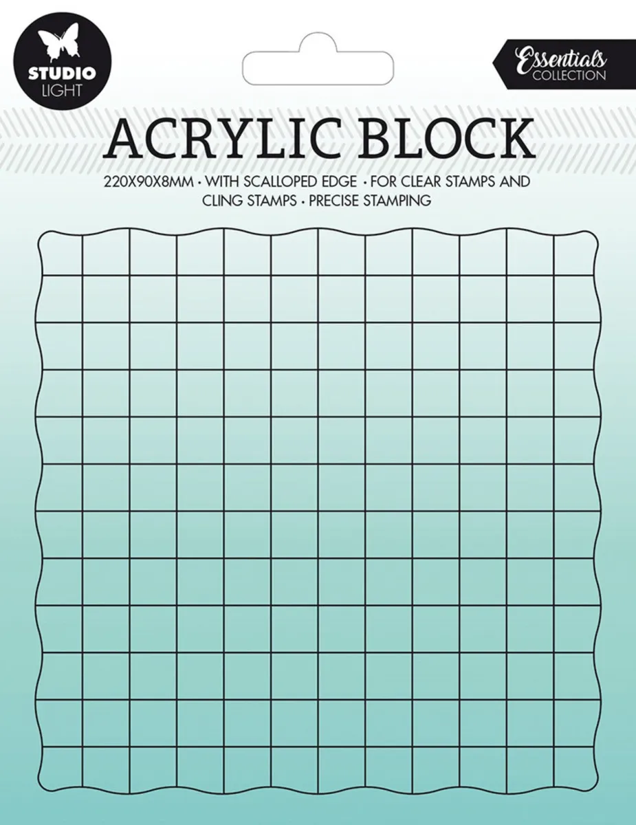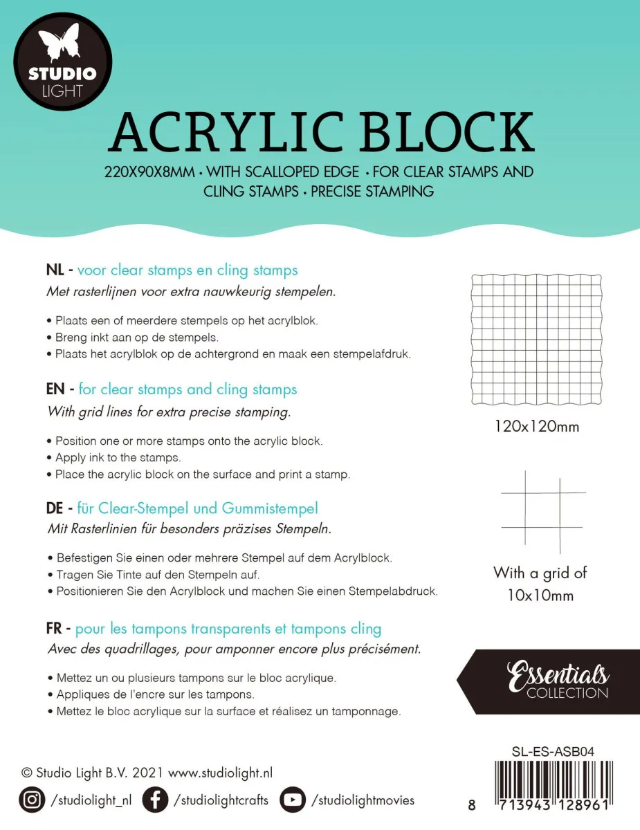 Acryl-Stempelblock für Clear Stamps und Cling Stamps. Mit Rasterlinien für besonders präzises Stempeln. Positioniere einen oder mehrere Stempel auf dem Acrylblock. Trage Tinte auf die Stempel auf. Setze den Acrylblock auf die Oberfläche und drucke den Stempel ab.